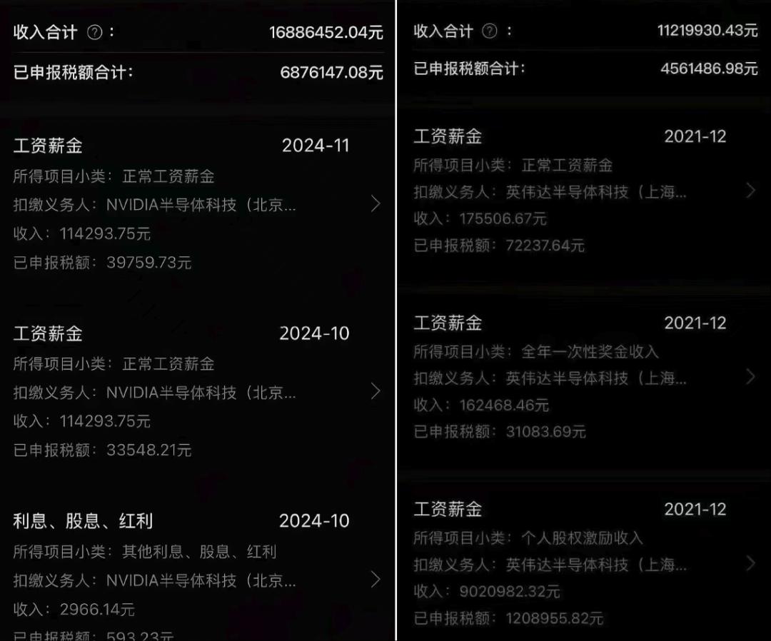 此外,近年來也有一些英偉達中國公司的員工在社交媒體上曬個稅申報記錄。2024年一位用戶在小紅書上發(fā)布的個稅申報截圖(下圖左)顯示,疑似英偉達北京公司的一名員工2024年度平均月薪11.42萬元,年度累計收入合計1688萬元。