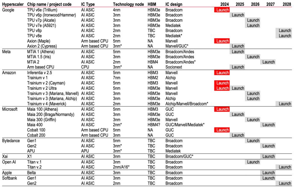 科技公司自研芯片路線圖,標(biāo)紅為已發(fā)布,*代表待確認,來源HSBC
