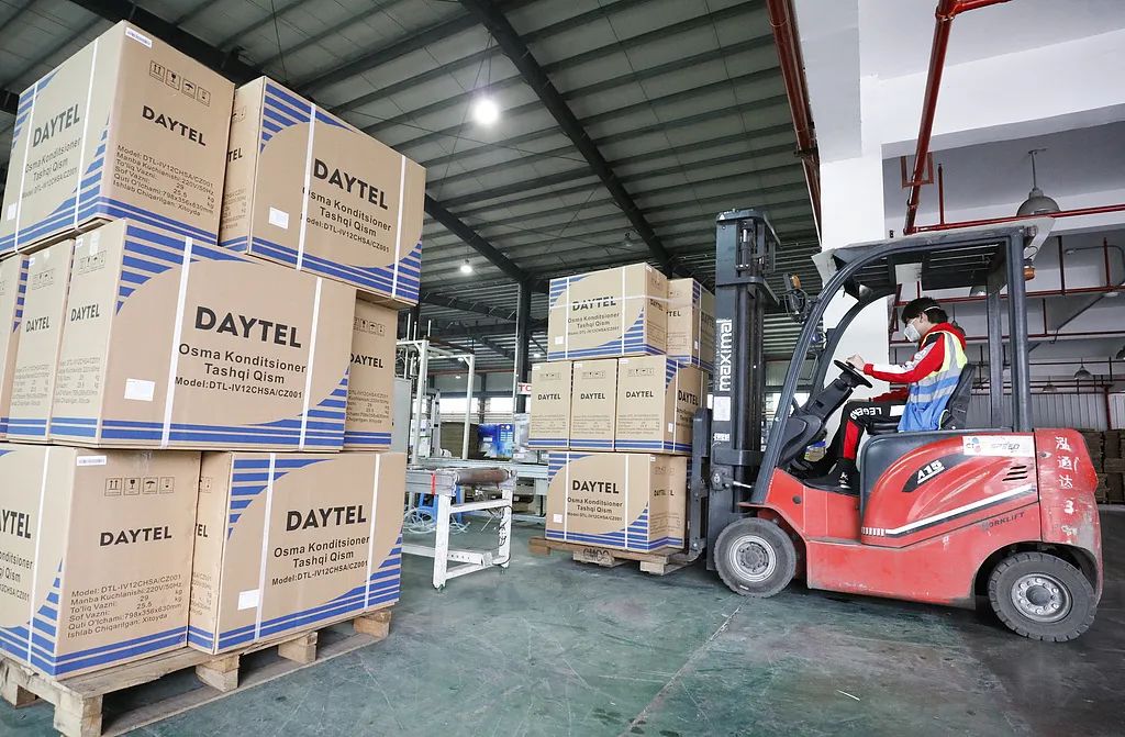 工人們正在生產(chǎn)線上組裝出口歐洲的空調(diào)機(jī)