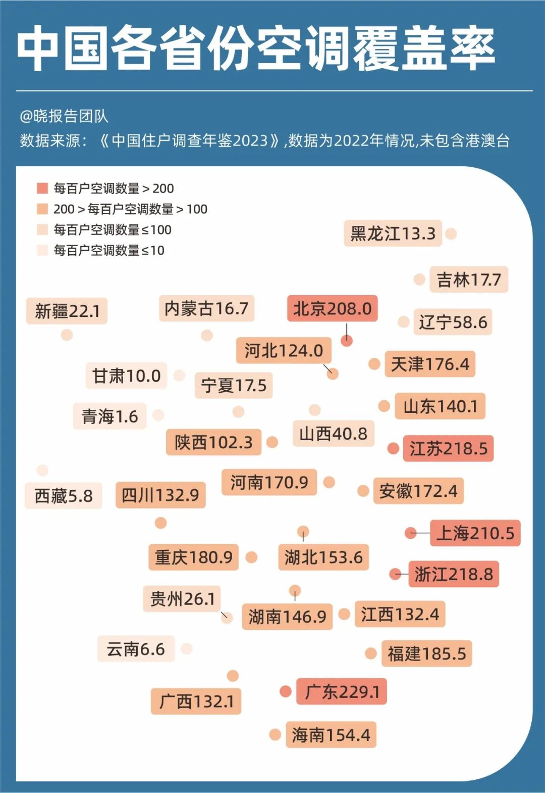 從全國范圍來看,空調(diào)普及率呈現(xiàn)出東多西少、南多北少的特點(diǎn),這與經(jīng)濟(jì)發(fā)展水平和氣候炎熱程度基本相符。