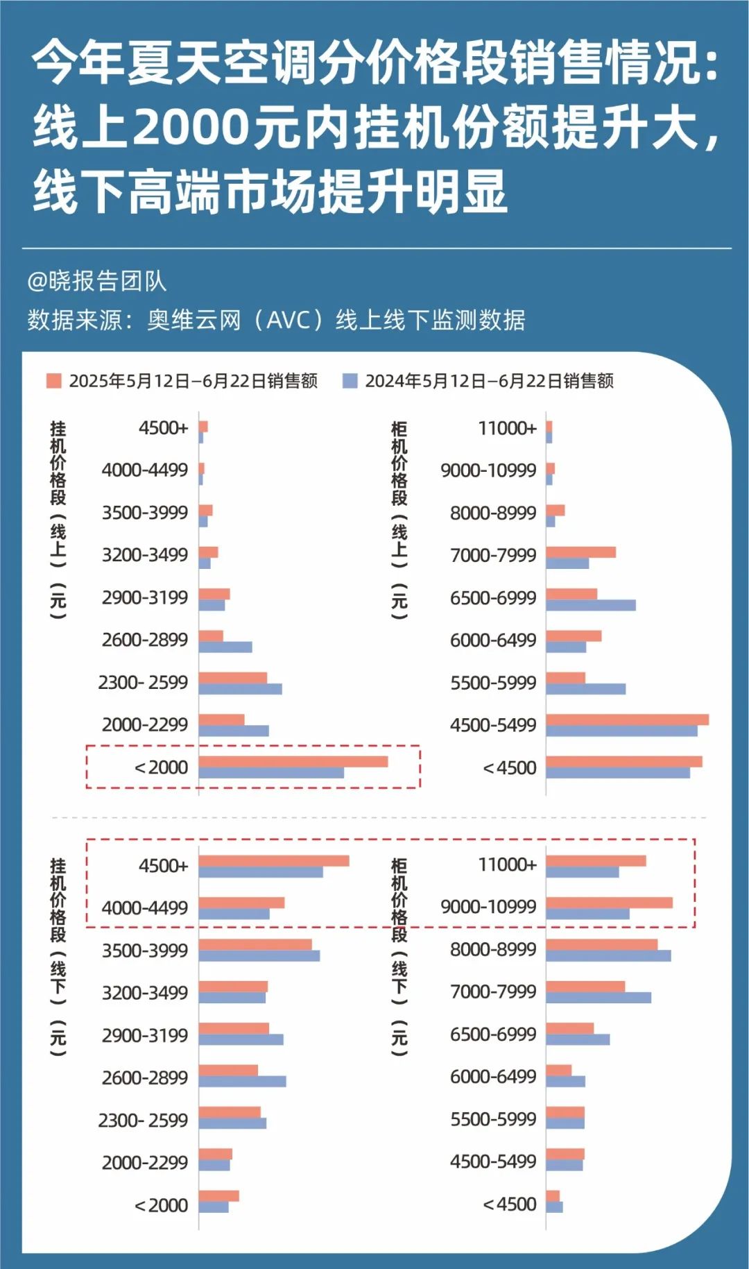 數(shù)據(jù)顯示,今年“618”期間,線下市場中,4500元以上的掛機(jī)銷售額占比從18.33%上升至22.05%;柜機(jī)在9000元以上價(jià)格段的占比也明顯上升。線上市場中,2000元以內(nèi)的掛機(jī)銷售額占比,從2024年的35.8%大幅上升至2025年的46.8%。