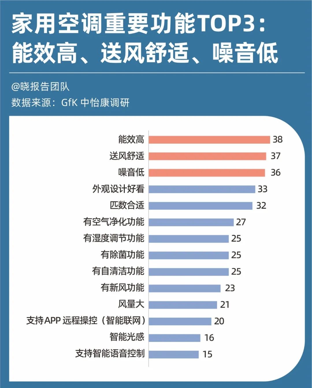 在需求方面,消費(fèi)者對空調(diào)的要求不再僅僅局限于制冷功能,而是希望空調(diào)具備更多的優(yōu)勢。中怡康的調(diào)研數(shù)據(jù)顯示,能效高、送風(fēng)舒適、噪音低、外觀設(shè)計(jì)好看、匹數(shù)合適是家用空調(diào)消費(fèi)關(guān)注的最重要的五個(gè)功能。