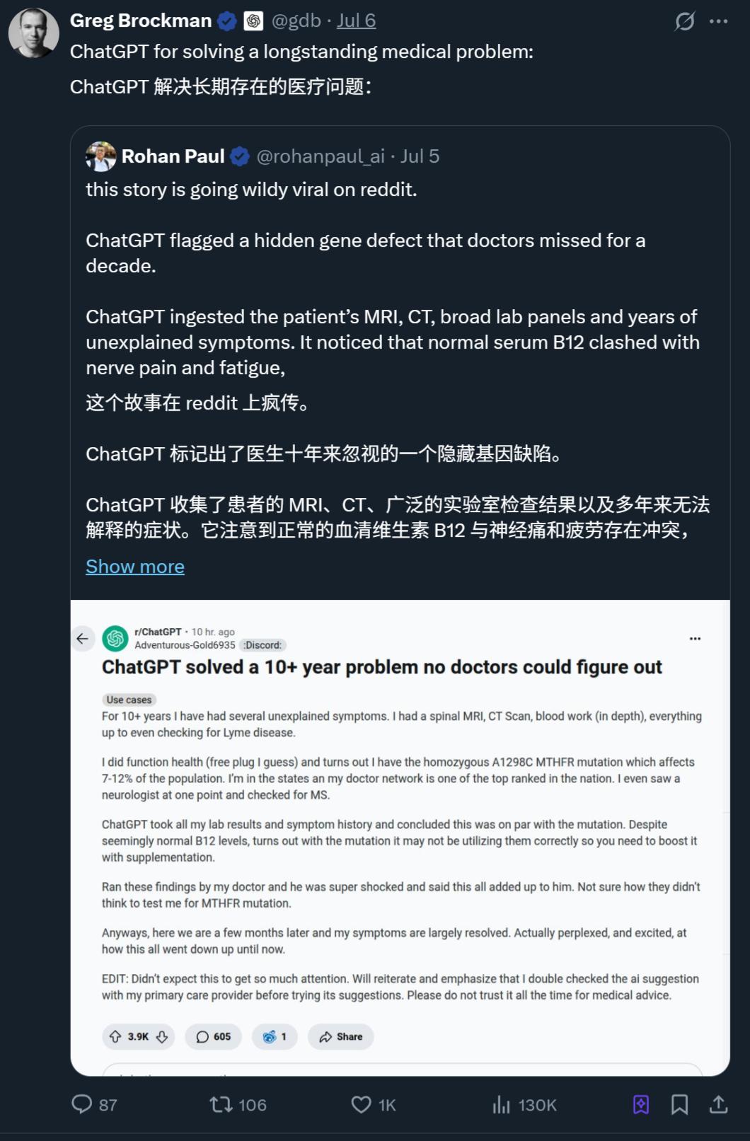 以ChatGPT為代表的AI早已滲透到日常生活中。AI醫(yī)療、AI教育、AI情感陪伴等領(lǐng)域,AI都能發(fā)揮獨(dú)特作用。最近,Reddit上瘋傳一則AI破解十多年疑難雜癥的故事,OpenAI總裁Greg Brockman還進(jìn)行了轉(zhuǎn)發(fā)。