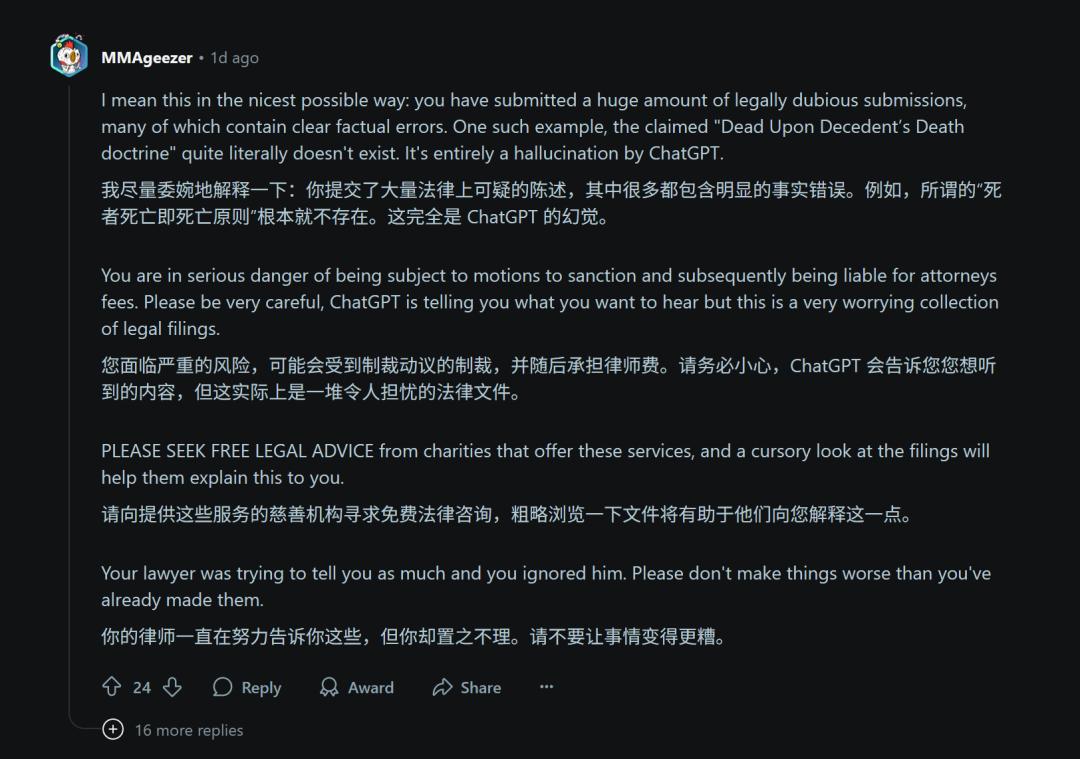 關(guān)于這一案件的討論,有相當(dāng)一部分集中在AI幻覺上。有好心人提醒Rejeana,ChatGPT貌似生成了大量包含明顯事實(shí)錯(cuò)誤的可疑陳述。