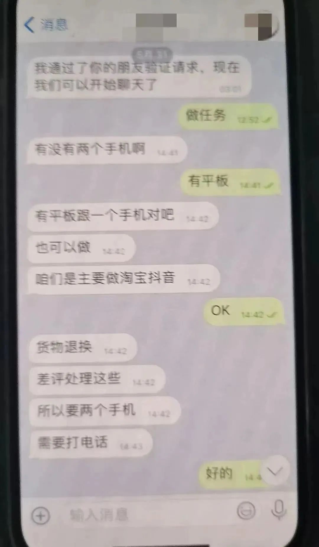 聽到1小時能賺120元,小張心動了,添加了對方qq號。對方稱需要兩個手機,或者一個手機、一個平板也可以。小張自己有平板和一部手機,但手機沒有電話卡不能打電話,于是他向同學借來了電話卡準備接任務。隨后,對方又引導小張下載軟件私聊,并表示只要按照“客服”的要求一步步操作就行。