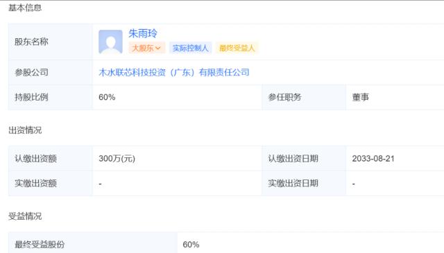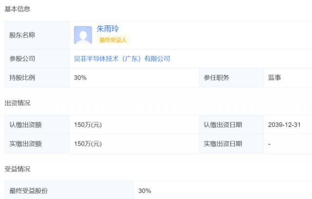 公開資料顯示,朱雨玲擔(dān)任貝菲半導(dǎo)體技術(shù)(廣東)有限公司、木水聯(lián)芯科技投資(廣東)有限責(zé)任公司等公司股東和高管。