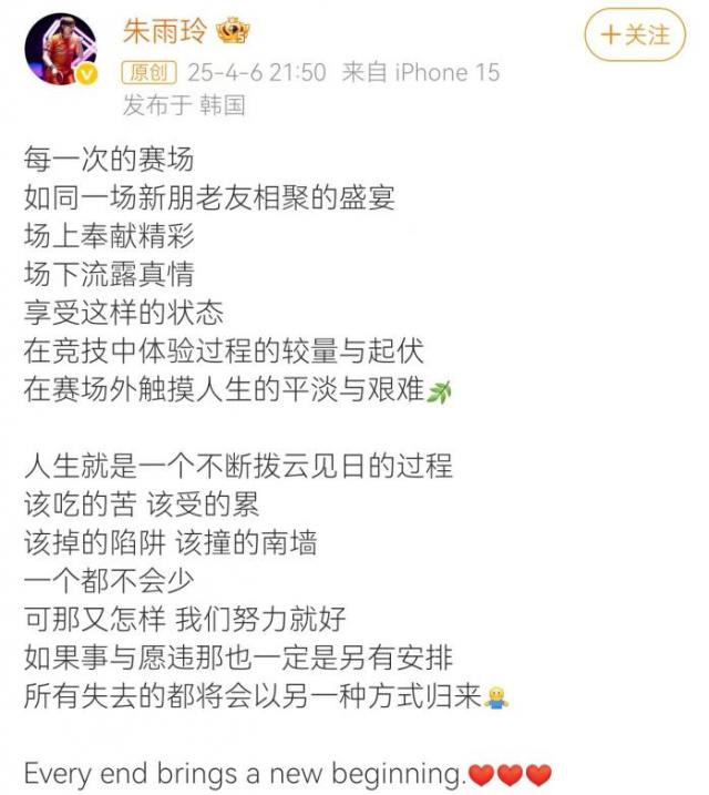 今年4月,朱雨玲發(fā)微博稱,每一次的賽場,如同一場新朋老友相聚的盛宴。場上奉獻(xiàn)精彩,場下流露真情。享受這樣的狀態(tài)!在競技中體驗(yàn)過程的較量與起伏,在賽場外觸摸人生的平淡與艱難。