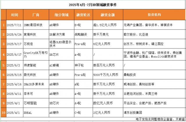 電子發(fā)燒友網(wǎng)統(tǒng)計(jì)4月至今的融資事件發(fā)現(xiàn),約三個(gè)月時(shí)間里,有10家XR領(lǐng)域企業(yè)完成新一輪融資,涵蓋AR智能眼鏡企業(yè)、顯示芯片企業(yè)、XR芯片企業(yè)、AI智能眼鏡企業(yè)。