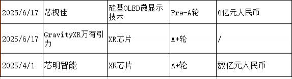 此次統(tǒng)計(jì)涉及三家芯片企業(yè),顯示芯片企業(yè)芯視佳、XR芯片企業(yè)萬(wàn)有引力、芯明科技。芯視佳完成6億元人民幣Pre - A輪融資,是此次統(tǒng)計(jì)中公開(kāi)融資金額最大的一筆。