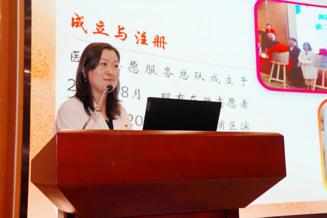 在全體與會(huì)者的共同見證下,黃浦區(qū)志愿者協(xié)會(huì)鄭重地將志愿者服務(wù)總隊(duì)隊(duì)旗授予醫(yī)院。