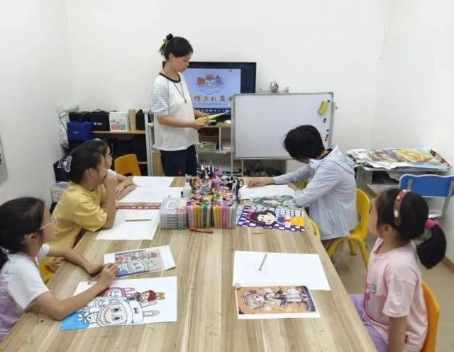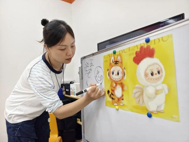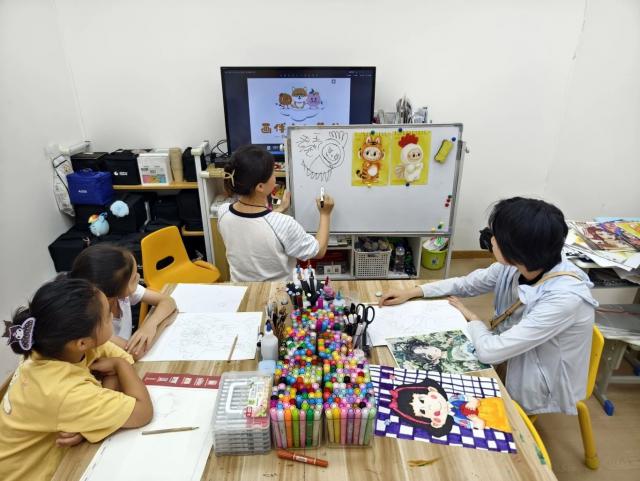 男生喜歡籃球,女生則鐘情畫畫。在二樓的另一個區(qū)域,是少兒美術(shù)訓(xùn)練營。在監(jiān)護人陪伴下,一些女孩來這里學(xué)畫畫。美術(shù)老師選了當(dāng)下流行的LABUBU玩偶畫像,作為小朋友繪畫入門的第一步,通過激發(fā)興趣、由易到難,引領(lǐng)他們走進美術(shù)世界。