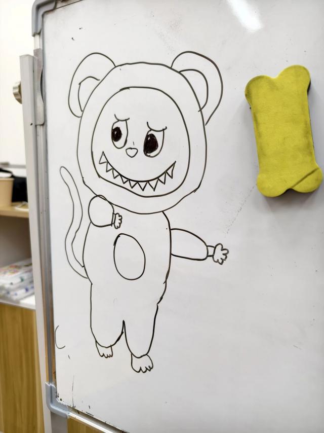 張同學(xué)的作品得到了老師和小朋友們的認可,老師還指出了不足之處,把LABUBU生肖猴的尾巴改成卷曲型,讓畫作更有“猴性”。