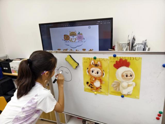張同學(xué)舉手爭取到第一個上場畫畫的機會,她屬猴,就選畫一幅LABUBU風(fēng)格的猴子生肖圖。此前,老師通過畫老虎、公雞,給小朋友傳授了LABUBU風(fēng)格生肖畫的技巧。