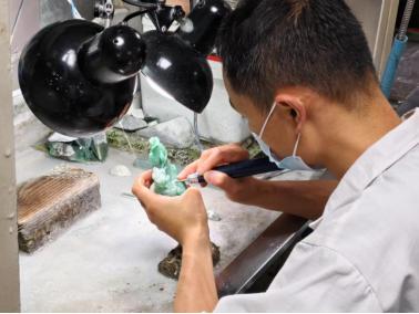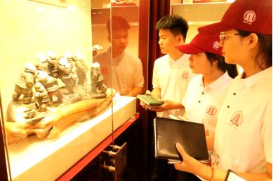 在中國玉雕大師創(chuàng)意園,調(diào)研隊員近距離目睹了本地玉雕大師將璞玉雕琢成神奇藝術(shù)品的高超技藝。大師們根據(jù)玉料的天然質(zhì)地、色澤和紋理,巧妙構(gòu)思,靈活運(yùn)用刻刀、打磨機(jī)等工具,融合切割、浮雕等技法,“因材施藝”“化瑕為瑜”,把一塊塊璞石變成了蘊(yùn)含深厚文化內(nèi)涵的藝術(shù)珍品。這無聲的“課堂”,讓學(xué)子們深刻體會到鎮(zhèn)平玉雕匠人精益求精、追求卓越的精神核心。