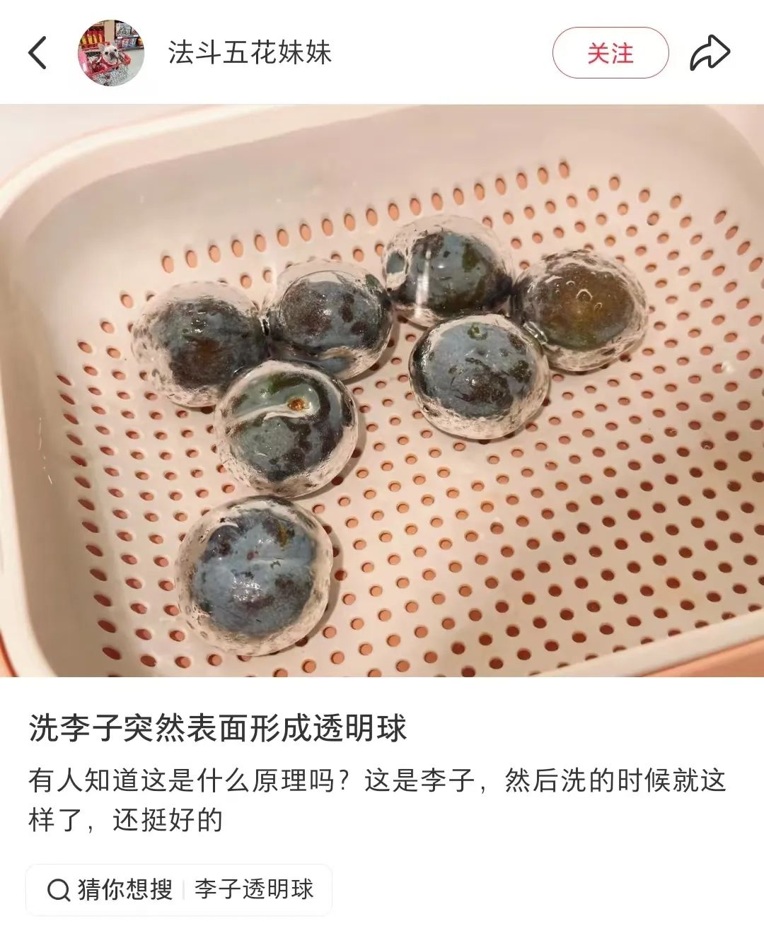 李子、葡萄等放入水中變透明,其實(shí)是經(jīng)典的物理光學(xué)現(xiàn)象。這些果子表面布滿了蠟質(zhì)結(jié)構(gòu)或者微小突起,疏水效應(yīng)使得水被迫“架”在了這些小結(jié)構(gòu)的頂端。這樣,在水的下方和果子真實(shí)的表皮上方之間,就困住了一層非常薄的空氣。