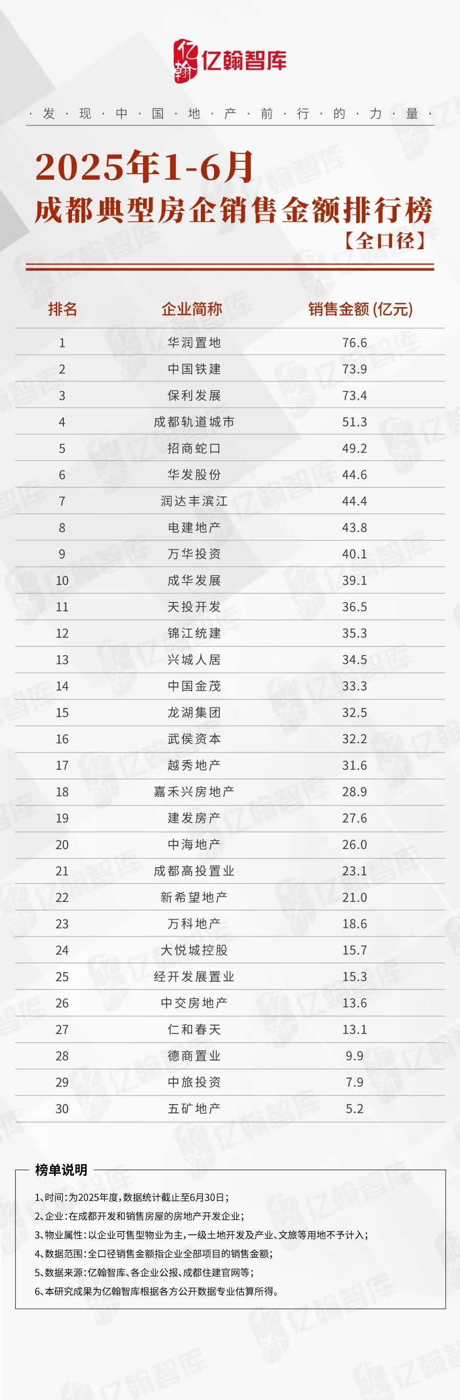 在上半年成都的銷售排行中,華潤置地脫穎而出,成功奪冠。華潤置地、中國鐵建、保利發(fā)展位列成都銷售業(yè)績TOP3。