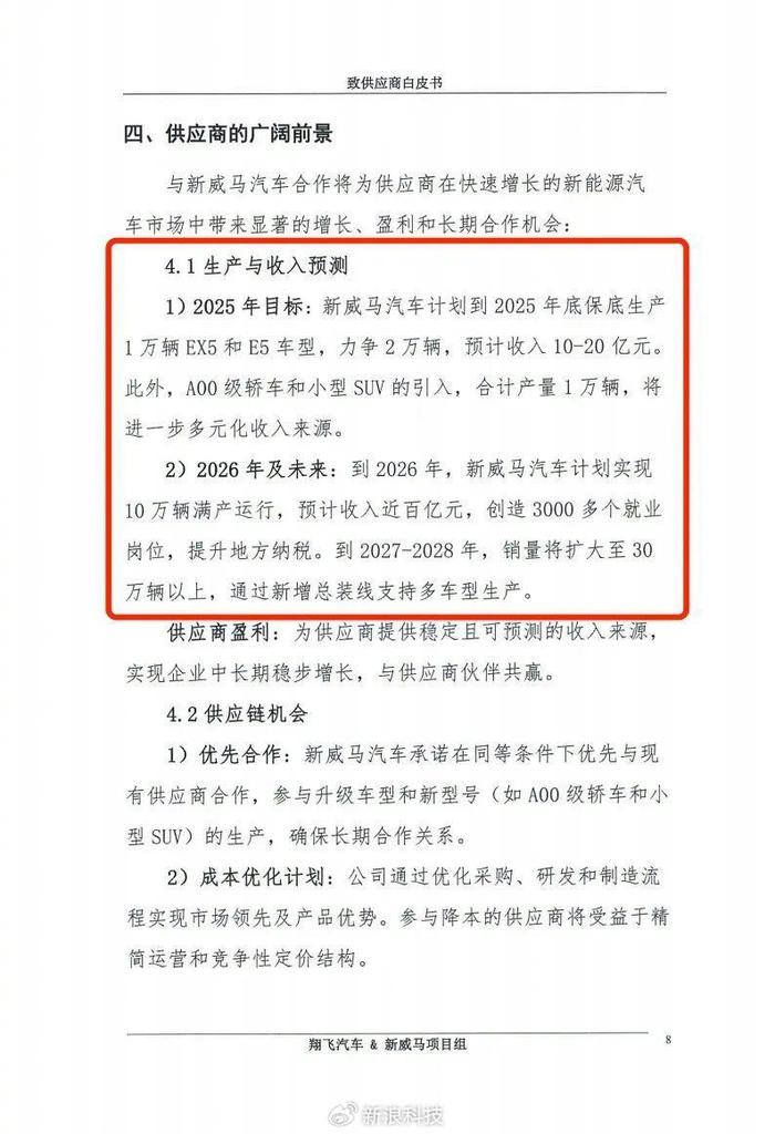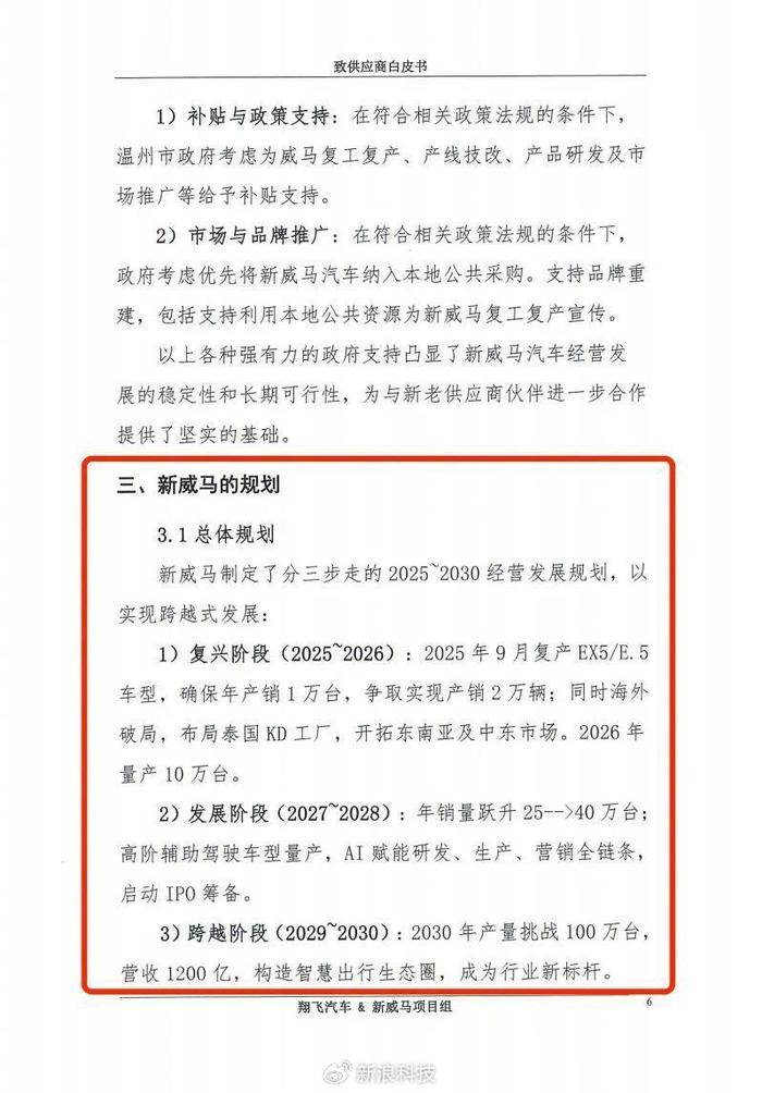 許久沒(méi)有消息的威馬汽車傳來(lái)好消息。7月14日,有威馬前員工向明鏡pro發(fā)送了“新威馬汽車”致供應(yīng)商的白皮書。在該文件中,新威馬汽車的投資人深圳翔飛汽車銷售公司(下稱“翔飛”)詳細(xì)披露了威馬的復(fù)產(chǎn)規(guī)劃和未來(lái)發(fā)展。