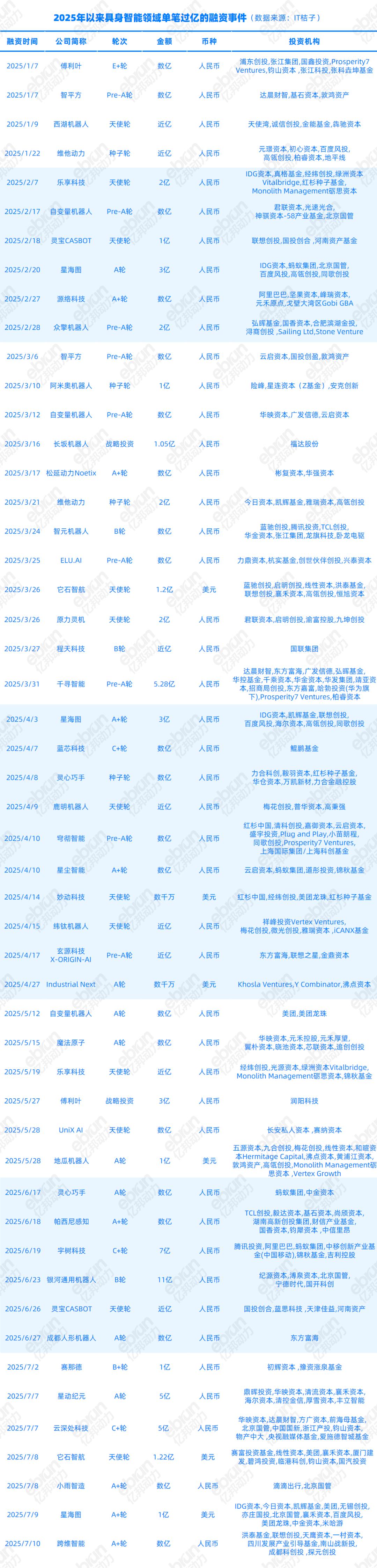 截至7月10日,2025年以來具身智能領(lǐng)域單筆過億的融資事件共有51起。