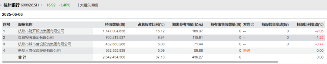 截至目前,在杭州銀行的前十大股東名單中,新華保險(xiǎn)是新進(jìn)股東。