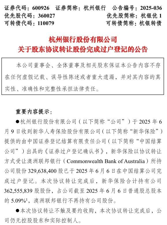 6月9日,杭州銀行發(fā)布公告稱,轉(zhuǎn)讓完成后,新華保險(xiǎn)合計(jì)持有公司約3.63億股股份,占公司截至2025年6月6日普通股總股本的5.09%。