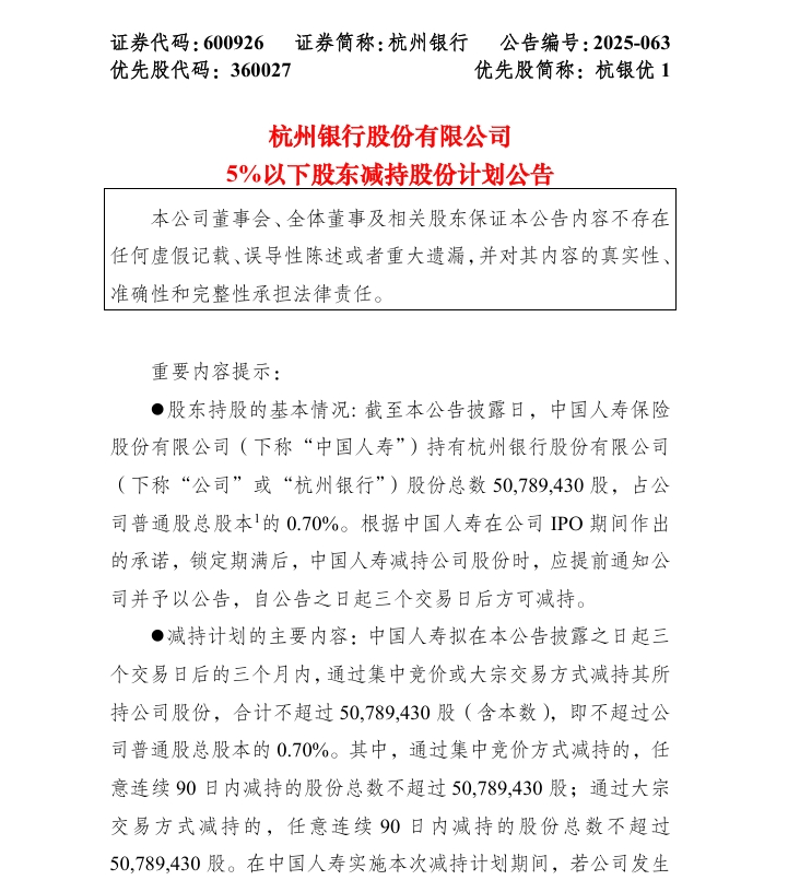 7月15日下午,杭州銀行(600926.SH)發(fā)布公告稱,截至公告披露日,中國人壽持有該行股份總數(shù)為5078.94萬股,占公司普通股總股本的0.70%。