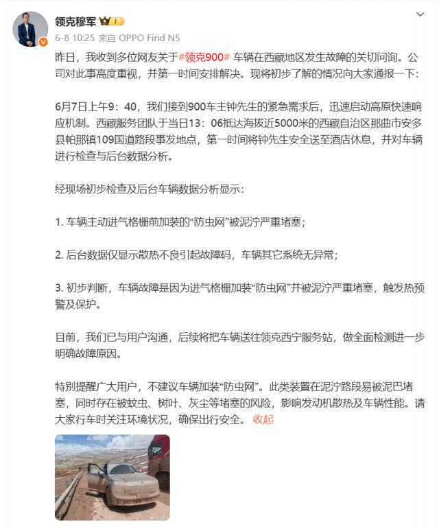 領(lǐng)克高管被嚇得不輕,在車(chē)主獲救后第一時(shí)間表示,這是因?yàn)檐?chē)主加裝的防蟲(chóng)網(wǎng)阻擋散熱,才導(dǎo)致車(chē)輛趴窩,并非車(chē)本身的問(wèn)題。
