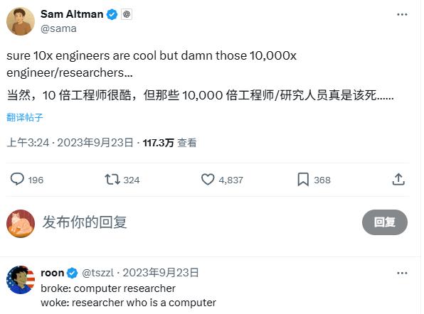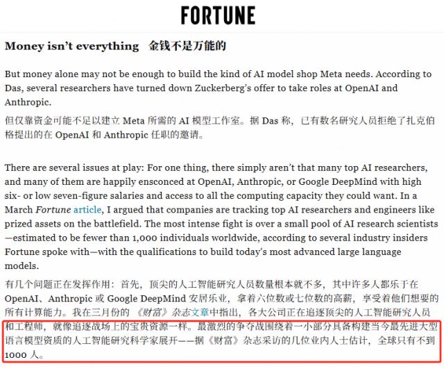 雖然這些操作看似離譜,但其實(shí)頂級AI人才和球星一樣稀缺?!?a href="http://www.slzrb.cn/news/caifugushi">財(cái)富》雜志采訪業(yè)內(nèi)人士得知,全球能真正推動大模型前進(jìn)的頂尖AI專家,總數(shù)不到1000人。OpenAI的奧特曼稱他們?yōu)椤叭f倍工程師”,意思是一個(gè)頂尖AI工程師的工作量能抵得上一萬個(gè)普通碼農(nóng)。