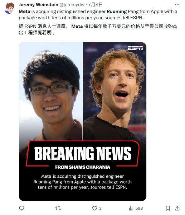 今天,他把OpenAI的團(tuán)隊(duì)負(fù)責(zé)人挖了過來,大大削弱了對手的實(shí)力;明天,又將蘋果基礎(chǔ)模型負(fù)責(zé)人招致麾下,讓本就不富裕的蘋果AI發(fā)展更加艱難。