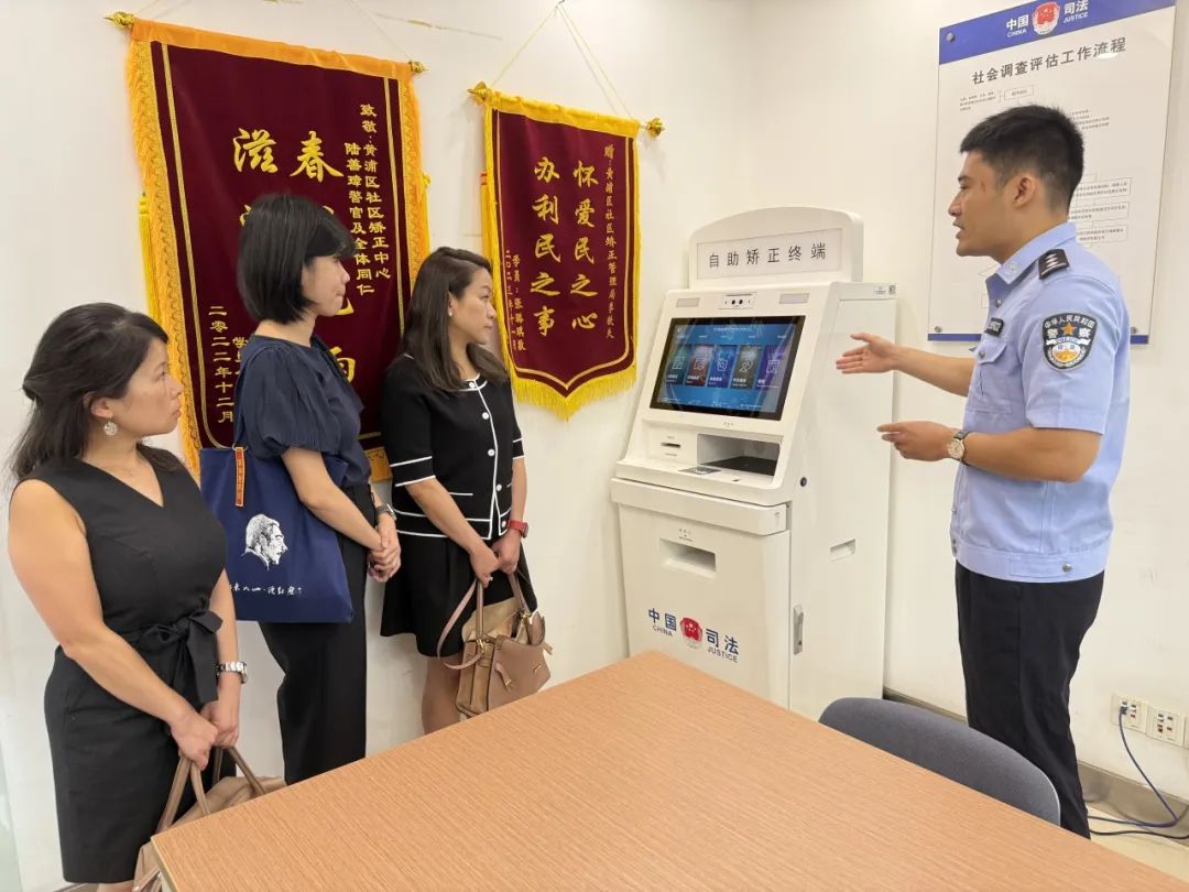 黃浦區(qū)社區(qū)矯正中心工作人員帶領(lǐng)參訪團(tuán)實(shí)地參觀了教育培訓(xùn)室、入矯宣告室、心理輔導(dǎo)室、指揮中心等功能區(qū)域,還演示了自助矯正終端等智慧矯正設(shè)備,并詳細(xì)介紹了社區(qū)矯正對(duì)象日常監(jiān)管、教育幫扶等工作做法。