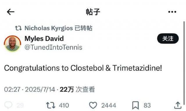 7月14日,克耶高斯在社媒發(fā)文稱:溫網(wǎng)結(jié)束,用一個詞來表達(dá)我們的感受。隨后他轉(zhuǎn)發(fā)了網(wǎng)友的發(fā)文:“恭喜氯司替勃和曲美他嗪?!?/p>