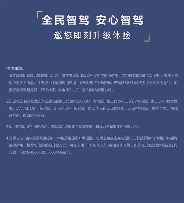 此次OTA覆蓋第二代秦PLUS DM - i/EV智駕版、宋L DM - i智駕版等多款車型,用戶收到推送后可直接升級或預約夜間更新。