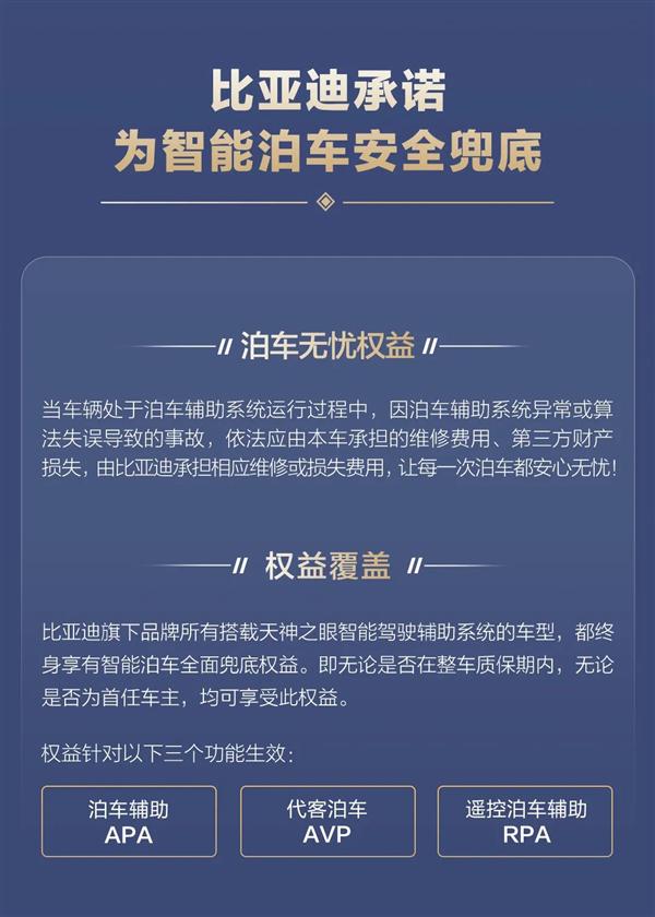值得關注的是,比亞迪同步推出智能泊車安全兜底權益:因泊車輔助系統(tǒng)異?;蛩惴ㄊд`導致的事故損失,無論是否在質保期、是否為首任車主,均可享受終身保障。