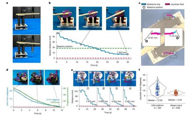 最終,該方法讓團(tuán)隊獲得跨平臺的機(jī)器人控制能力。在使用16自由度的商用Allegro靈巧手測試時,關(guān)節(jié)角度誤差小于3 °,指尖位置誤差小于4mm;用3D打印的15氣動通道軟體手,能精準(zhǔn)抓取工具且具備抗遮擋能力;在采用剪切拉脹材料的HSA柔性腕平臺上應(yīng)用,附加350g負(fù)重后仍有7.3 mm精度;用3D打印的Poppy教育機(jī)械臂,零部件公差較大時,誤差小于6 mm。