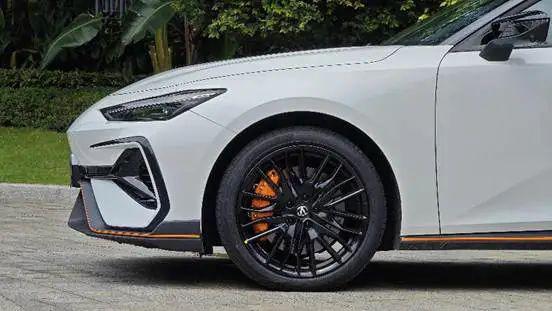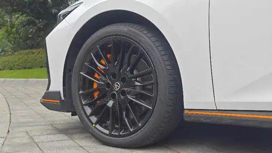除了外觀帥氣,19 英寸熏黑輪轂搭配鄧祿普運(yùn)動(dòng)輪胎,內(nèi)部 350mm 直徑打孔剎車(chē)盤(pán)和黃色四活塞卡鉗,不僅抓地力強(qiáng),制動(dòng)效果也十分出色。