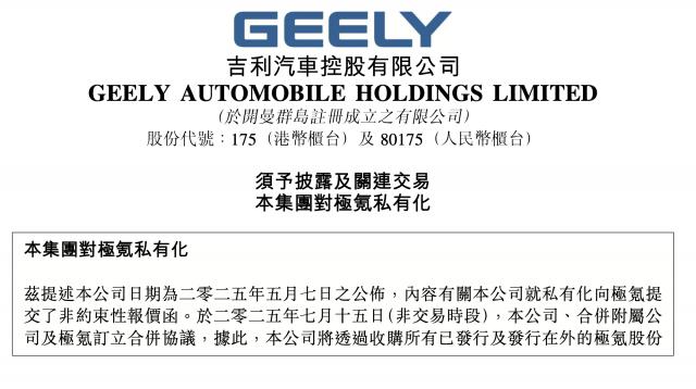 7 月 15 日,吉利控股集團(tuán)宣布,旗下吉利汽車控股有限公司(以下簡(jiǎn)稱“吉利汽車”,股票代碼:0175.HK)與極氪智能科技有限公司(以下簡(jiǎn)稱“極氪”,股票代碼:NYSE:ZK)正式簽署合并協(xié)議。吉利汽車將收購(gòu)其尚未持有的全部極氪股份,極氪股東可選擇以現(xiàn)金或置換吉利汽車股份作為對(duì)價(jià)。合并完成后,極氪將成為吉利汽車全資子公司,實(shí)現(xiàn)私有化并在紐交所退市。