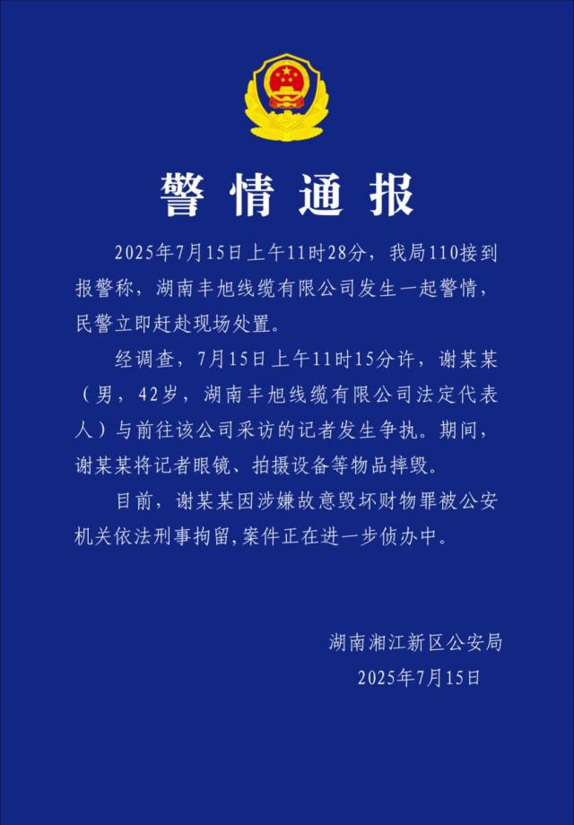 7月15日上午11時(shí)15分左右,謝某某(男,42歲,湖南豐旭線纜有限公司法定代表人)與前往該公司采訪的記者發(fā)生爭(zhēng)執(zhí)。在此期間,謝某某將記者的眼鏡、拍攝設(shè)備等物品摔毀。