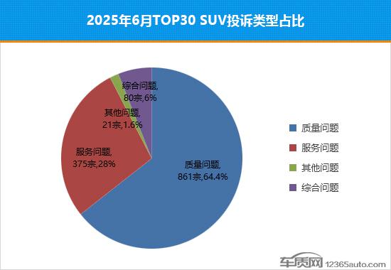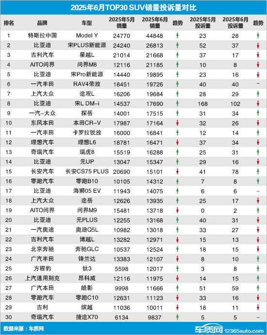 2025年6月TOP30 SUV銷量與投訴量點評分析