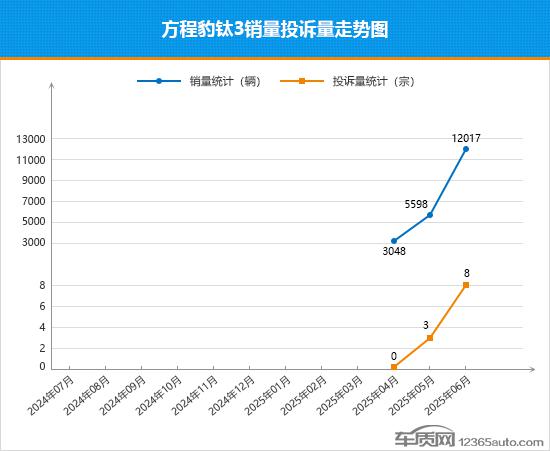 方程豹鈦3是比亞迪旗下方程豹汽車鈦系列首款車型,上市之初就受市場關(guān)注。上市3個月銷量破萬,展現(xiàn)"黑馬"潛質(zhì)。其科幻感的"機甲"外觀、領(lǐng)先同級的智能化配置與輔助駕駛、越野與通勤的平衡設(shè)計以及親民起售價,吸引了多元用戶。口碑方面,月投訴走勢與銷量同步,雖逐月提升但在合理范圍,短期口碑值得肯定。6月投訴銷量比數(shù)值略增但仍為個位數(shù),整體好于多數(shù)榜單車型,短期市場有望繼續(xù)沖高,未來能否成"現(xiàn)象級"產(chǎn)品值得期待。