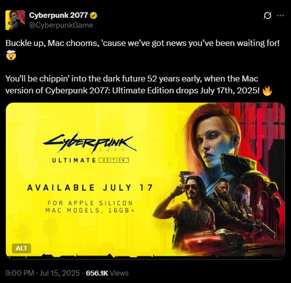 《賽博朋克2077:終極版》明日登錄蘋果Mac,支持光追體驗