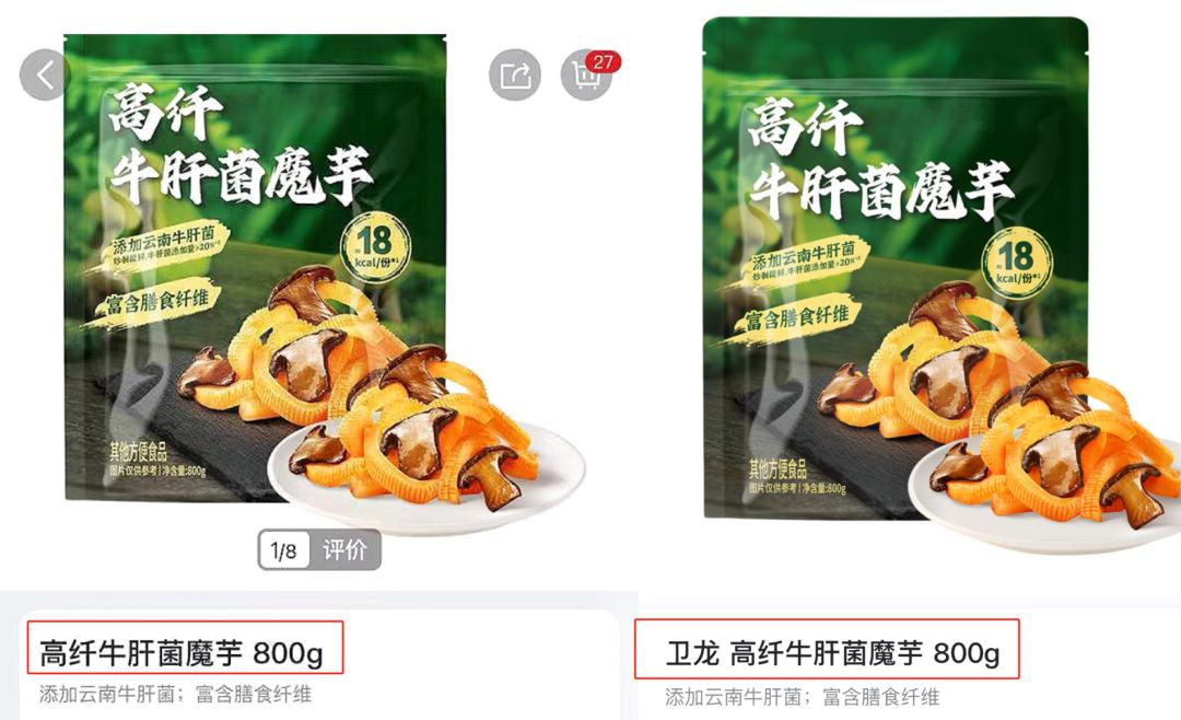 還有網(wǎng)友發(fā)現(xiàn),山姆一款“高纖牛肝菌魔芋”產(chǎn)品由衛(wèi)龍生產(chǎn),但商品圖片上沒有衛(wèi)龍品牌標(biāo)識(shí),疑似“有意弱化該品牌”。