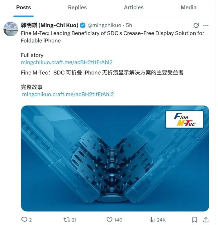 7月15日消息,天風(fēng)國際證券分析師郭明錤發(fā)布博文,報(bào)道稱蘋果計(jì)劃推出的可折疊iPhone,將采用SDC(三星顯示)的無折痕顯示解決方案,以確保可折疊iPhone能夠在2026年下半年穩(wěn)定量產(chǎn)。