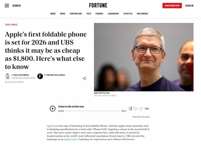 另一消息源報(bào)道了瑞銀集團(tuán)(UBS)的一份分析師報(bào)告,該報(bào)告解析了蘋果折疊iPhone的定價(jià)、物料成本以及供應(yīng)鏈合作等關(guān)鍵信息。
