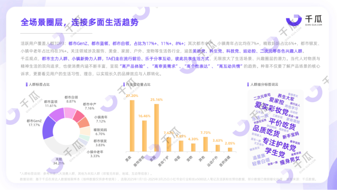 根據(jù)千瓜數(shù)據(jù),小紅書(shū)用戶以年輕女性群體為主,年齡集中在18 - 34歲,主要分布在一二線城市,追求時(shí)尚和美好生活,消費(fèi)意愿和能力較強(qiáng)。