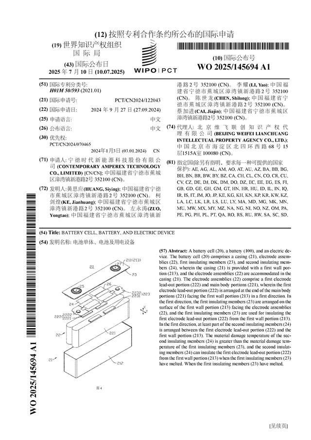 寧德時代披露“電池單體、電池及用電設備”國際專利申請