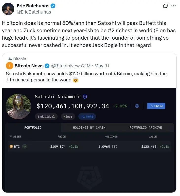 行業(yè)分析師Eric Balchunas在上月的一篇X平臺(tái)帖子中曾大膽預(yù)測(cè),中本聰?shù)?026年底至少會(huì)成為全球第二大富豪。他當(dāng)時(shí)表示,如果比特幣實(shí)現(xiàn)“正常的每年50%”漲幅,中本聰很可能會(huì)在“明年某個(gè)時(shí)候”攀升至富豪榜第二位。