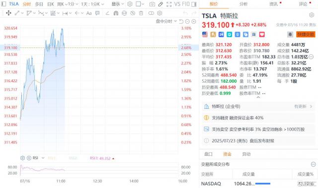 截至發(fā)稿時,特斯拉股價上漲2.68%,報319.1美元,目前總市值達1.03萬億美元。