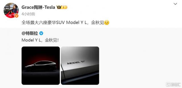 隨后,特斯拉副總裁陶琳轉(zhuǎn)發(fā)該條微博并透露,Model Y L是全場景大六座豪華SUV。