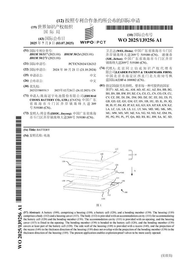 珠海冠宇公布“電池”國際專利申請(qǐng)
