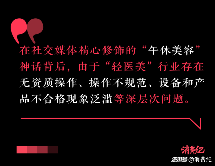 然而,輕醫(yī)美也存在諸多問題。行業(yè)存在無資質(zhì)操作、操作不規(guī)范、設(shè)備和產(chǎn)品不合格等現(xiàn)象,“美容”變“毀容”案例頻發(fā)。非法注射物占比高,非法從業(yè)者數(shù)量多。即便輕醫(yī)美,也存在感染、血管栓塞等風(fēng)險(xiǎn)。