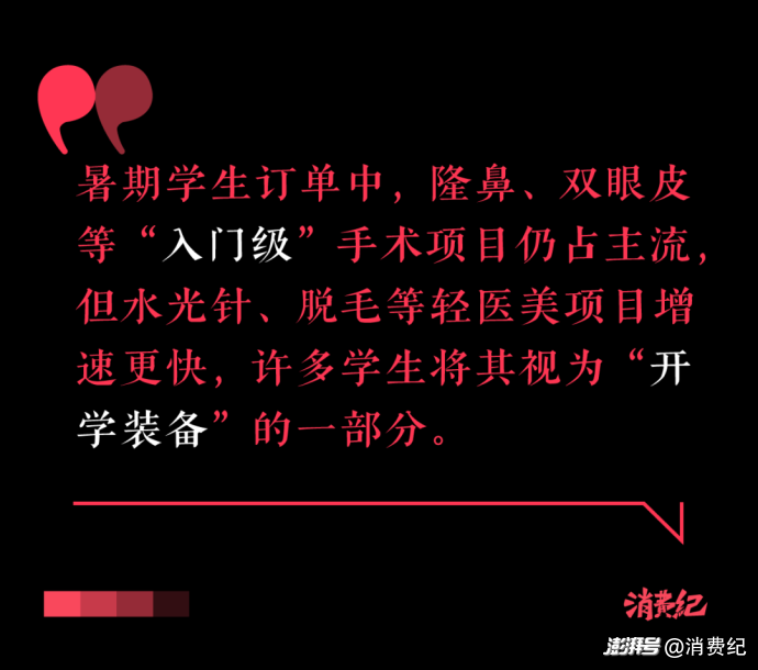 醫(yī)美主力軍已不是傳統(tǒng)的“貴婦”。95后、90后占比超六成,00后近20%。畢業(yè)季和暑期,整形醫(yī)院咨詢量和手術(shù)量激增,學(xué)生成為消費(fèi)主力。除學(xué)生外,年輕男性也成為輕醫(yī)美增長(zhǎng)新引擎,他們偏愛毛發(fā)移植、瘦臉針等項(xiàng)目。